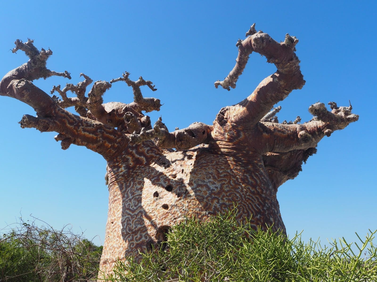 The reason for the extraordinary trunk girth in baobabs is so that they can survive in a hot and dry environment. The giant trunks are capable of storing water very efficiently like a giant sponge! The growth rings of baobabs are very faint, and it’s difficult to age them in the same way as other tree species, but the largest specimens in Madagascar are thought to be over 500 years old.