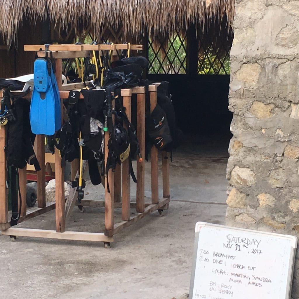 Minutes later I am summoned by Blue Ventures’ Dive Manager Laura MacGuire to help the team move air tanks from storage to the “kit pit” – the area where we set up and sort our diving gear each morning. The tanks are heavy, but it’s a nice workout with a splendid view of Ataúro’s hills, which are now, in the wet season, lush and green.