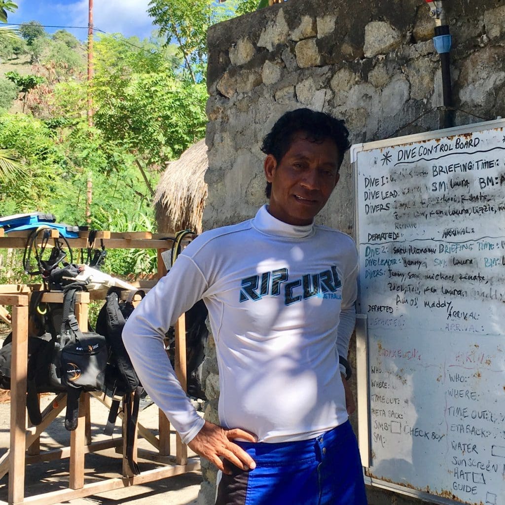 We bring our gear to the dive boat, Tasi Mos, and captain Antonio helps us aboard. We are lucky today as the view of Manakoko, the island’s highest mountain, is crystal clear.