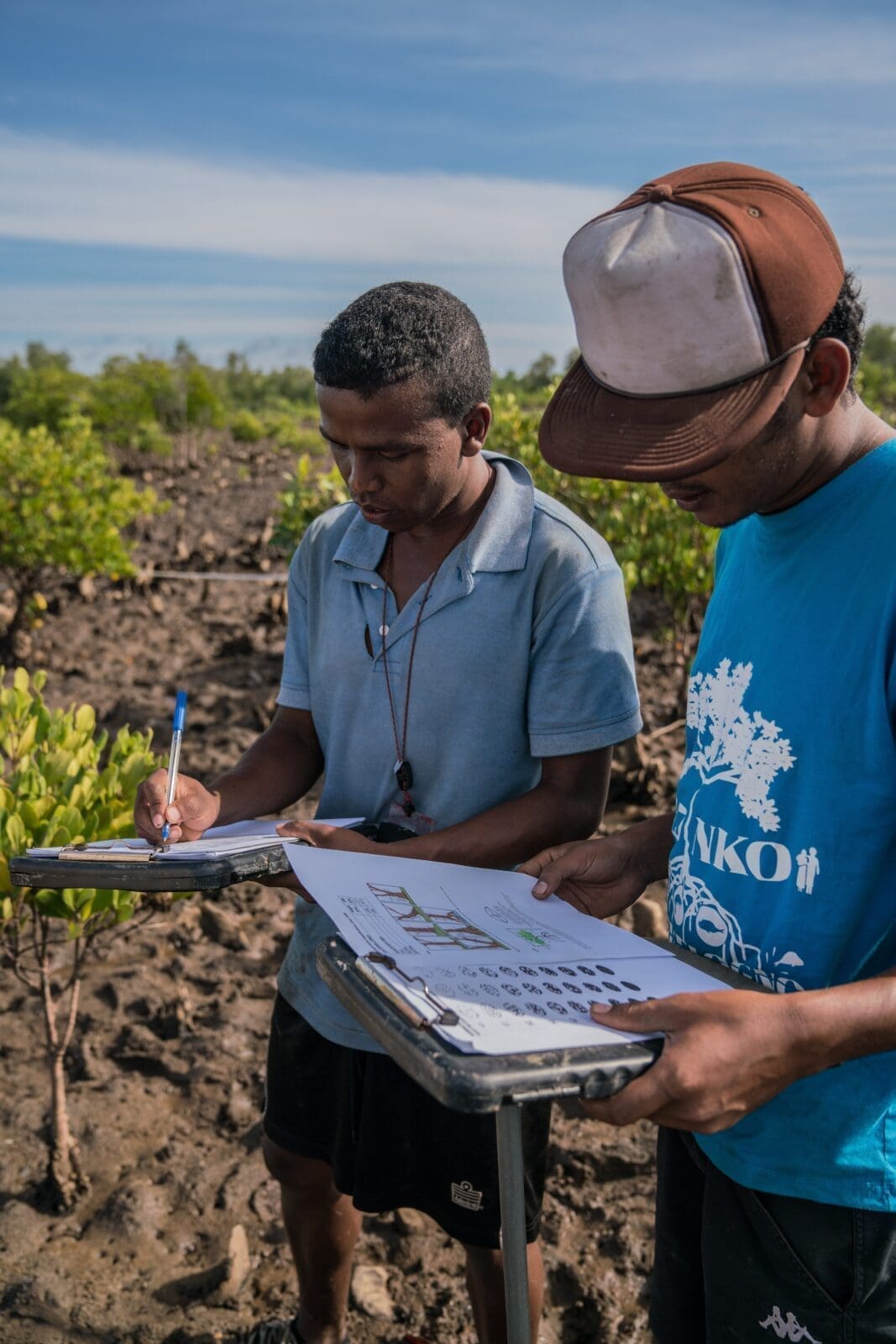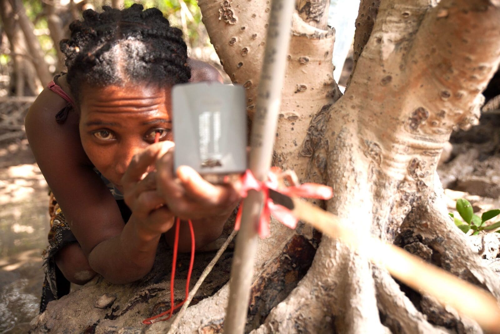 Then there is the reality of the field: long walks under the hot sun to reach a plot, with feet sinking into the mud with each step; the marking of the perimeter of the plot using sticks and ribbon and the installation of the measuring equipment; the fast and accurate measurements in a race against the tide – the mangrove plots become submerged in water at high tide, so the data collectors only have a few hours each day to carry out their work.