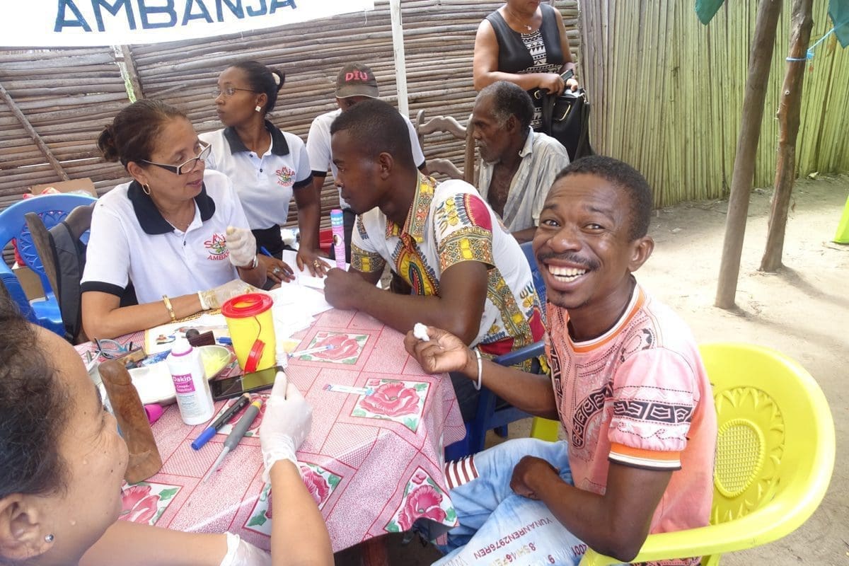 The NGO Marie Stopes Madagascar has mobilised teams from the capital Antananarivo to offer cervical cancer screening. The Lion’s Club offers a diabetes screening, the Ambanja Service Médical Inter-Entreprise (SMIA) and the Action for Justice and Progress of Populations (AJPP) provide HIV-AIDS screening. The mutual fund Tsiharofy recalls the link between health insurance and access to care. Dentists from SMIA distribute toothbrushes and toothpaste to children, while teaching them good dental hygiene techniques. Community health workers are conducting nutritional monitoring of children and screening for malnutrition. Most importantly, the district health service provides general consultations, prenatal consultations, child immunisation and deworming. In front of its stand (the busiest, by far!), a large crowd is waiting, revealing how much work is still needed to improve access to basic health services in this area.