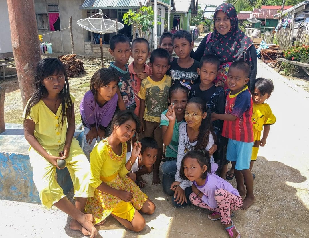 The kids follow us down the narrow street that meets the pier. Lining the street are small shacks with ketek walls made of woven strands of bamboo, built either on stilts to raise them above the water or on piles of earth and dead coral. We make a turn and step onto the wooden pier that connects a group of houses on the furthest side of the village. The pier has seen better days and we must watch our step to avoid any loose planks or holes. The LINI field team leads the way, Neni holding Kia’s hand, who is dressed in an incredible bright yellow, full-body Pikachu outfit and has insisted, despite the treacherous steps, on walking.