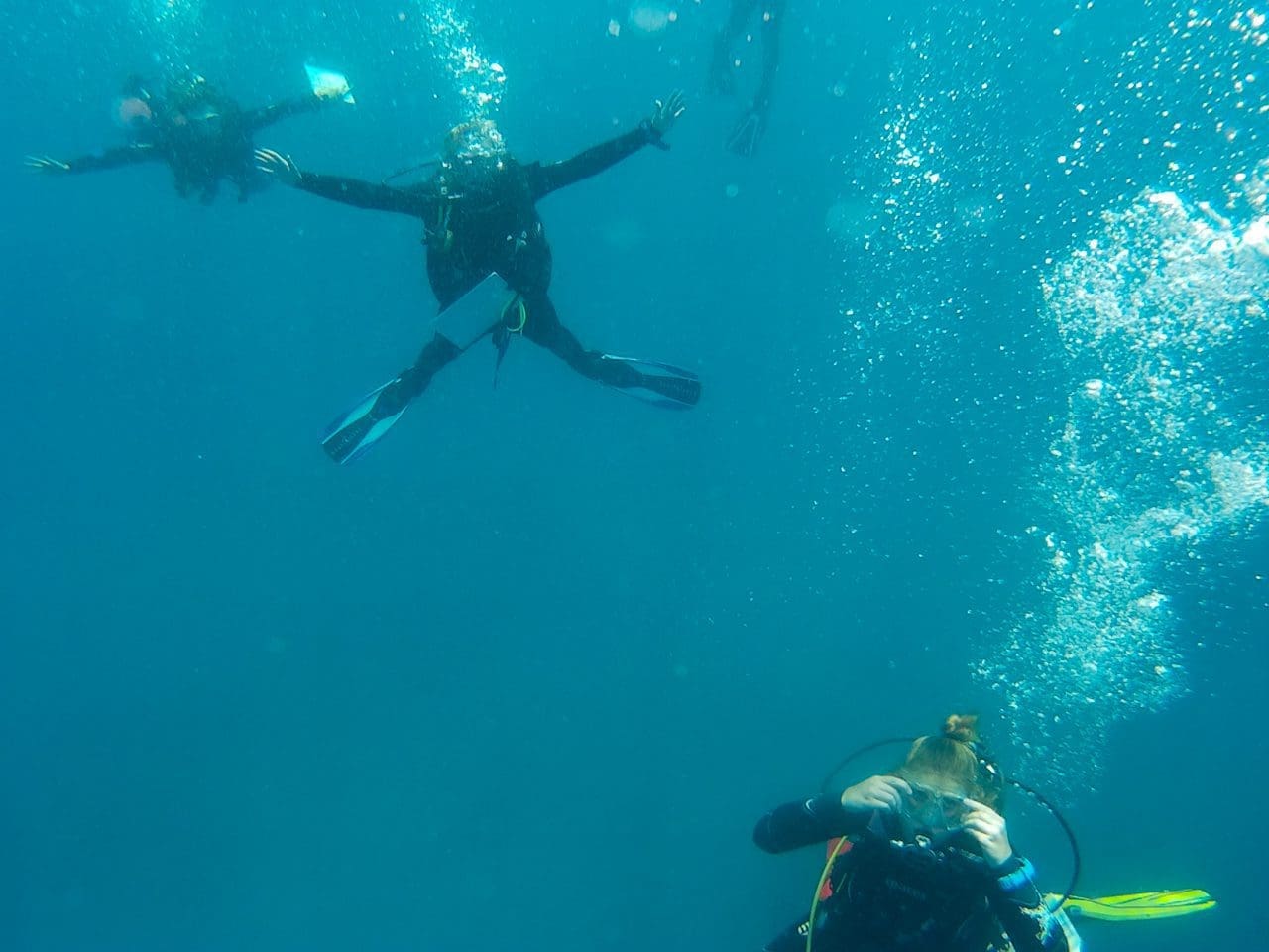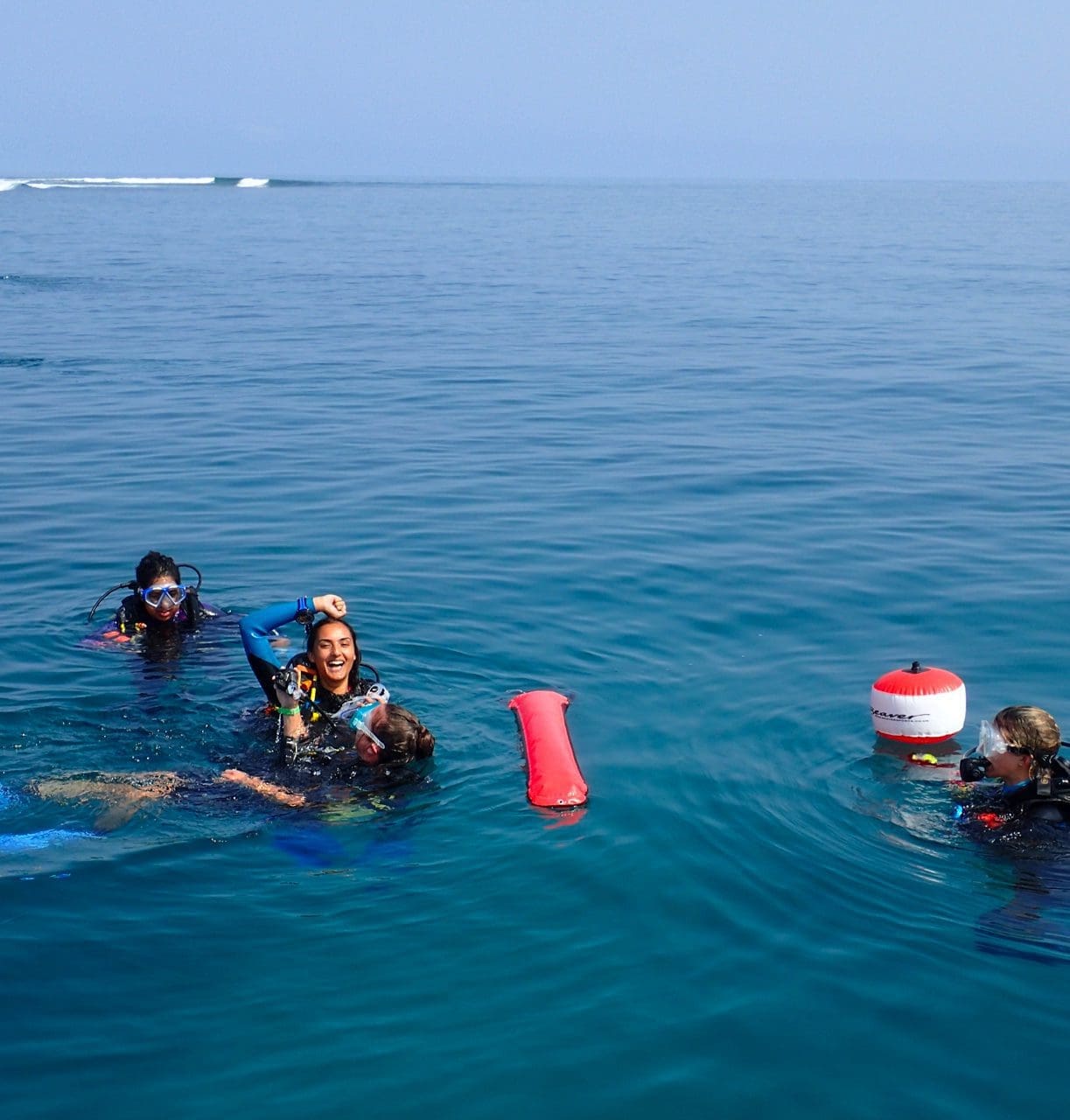 …and off we go! The 30th dive of our expedition on a scorching 30-degree day. All geared up with regulators in our mouths and tanks on our backs, we roll off the speedboat into the turquoise-blue sea.