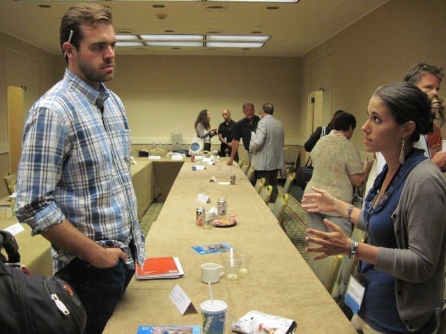 At the end of the workshop, Jen and Travis Riggs of Sea2Table, a sustainable seafood distributor linking fishers and chefs, discuss the possibilities for listing Belizean lionfish on his website. (Photo credit: Traditional Fisheries)