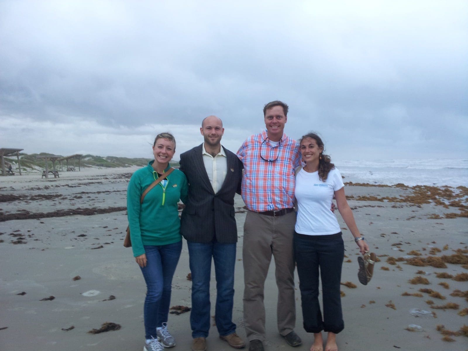 (L-R) Dr. Stephanie Green (Oregon State University), Alexander Bogdanoff (NOAA), Dr. James Morris Jr. (NOAA) and Jennifer Chapman (Blue Ventures) on the windy beach at Padre Island, TX, USA.