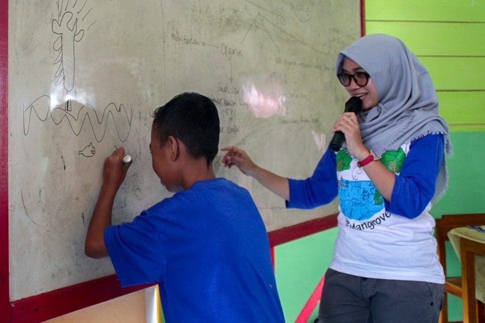 Ibu (ma’am), do you realise that the weather is different from how it used to be? The climate is changing, fishers go further to catch, why? Coral reefs and mangroves are habitats for marine life, so if they are damaged, we need to look elsewhere to find fish. We need to prepare more fuels, more energy and money – we will not benefit from damaged environments.”