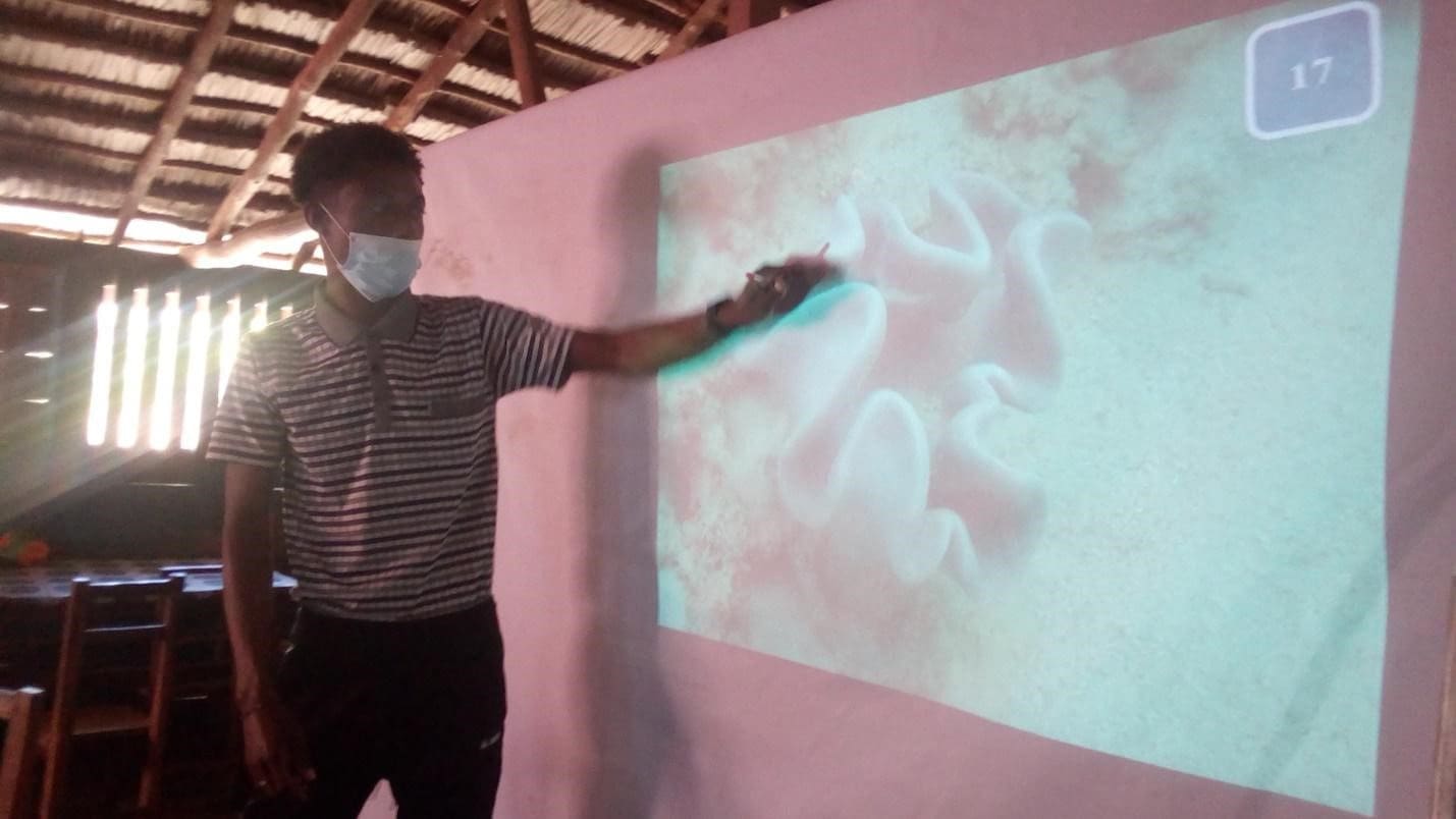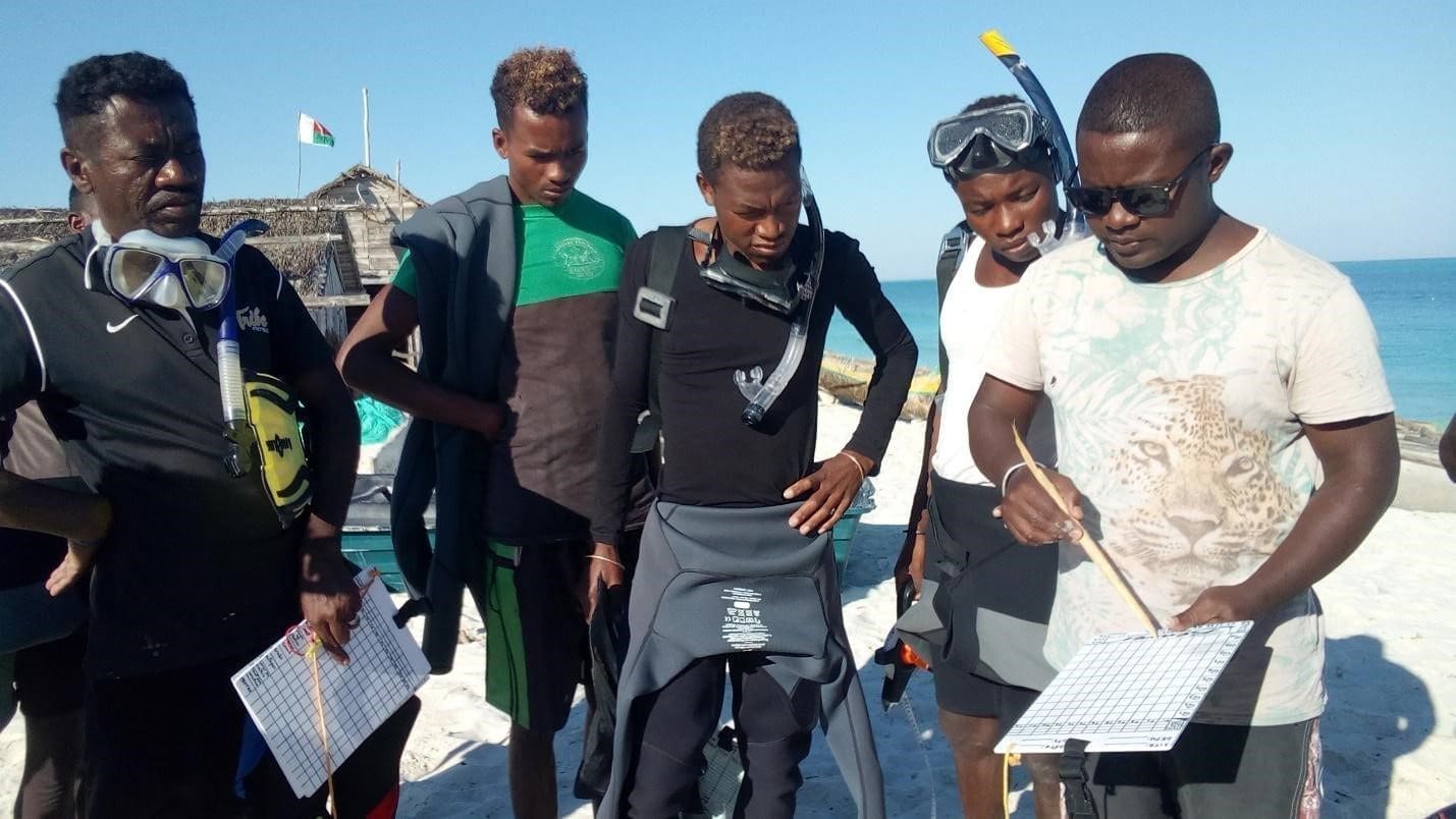 Last year, myself, Sylvester, Patin, Ronaldo and Damas became the first ecological monitoring team in the region composed entirely of community members. Before this, most of the monitoring had been done by Blue Ventures Expeditions (BVE) volunteers; when the Covid-19 pandemic hit, that all changed. We were trained by Javier and James to identify species, collect data in the water and analyse these data so that we could better understand the condition of our MPA and LMMA.